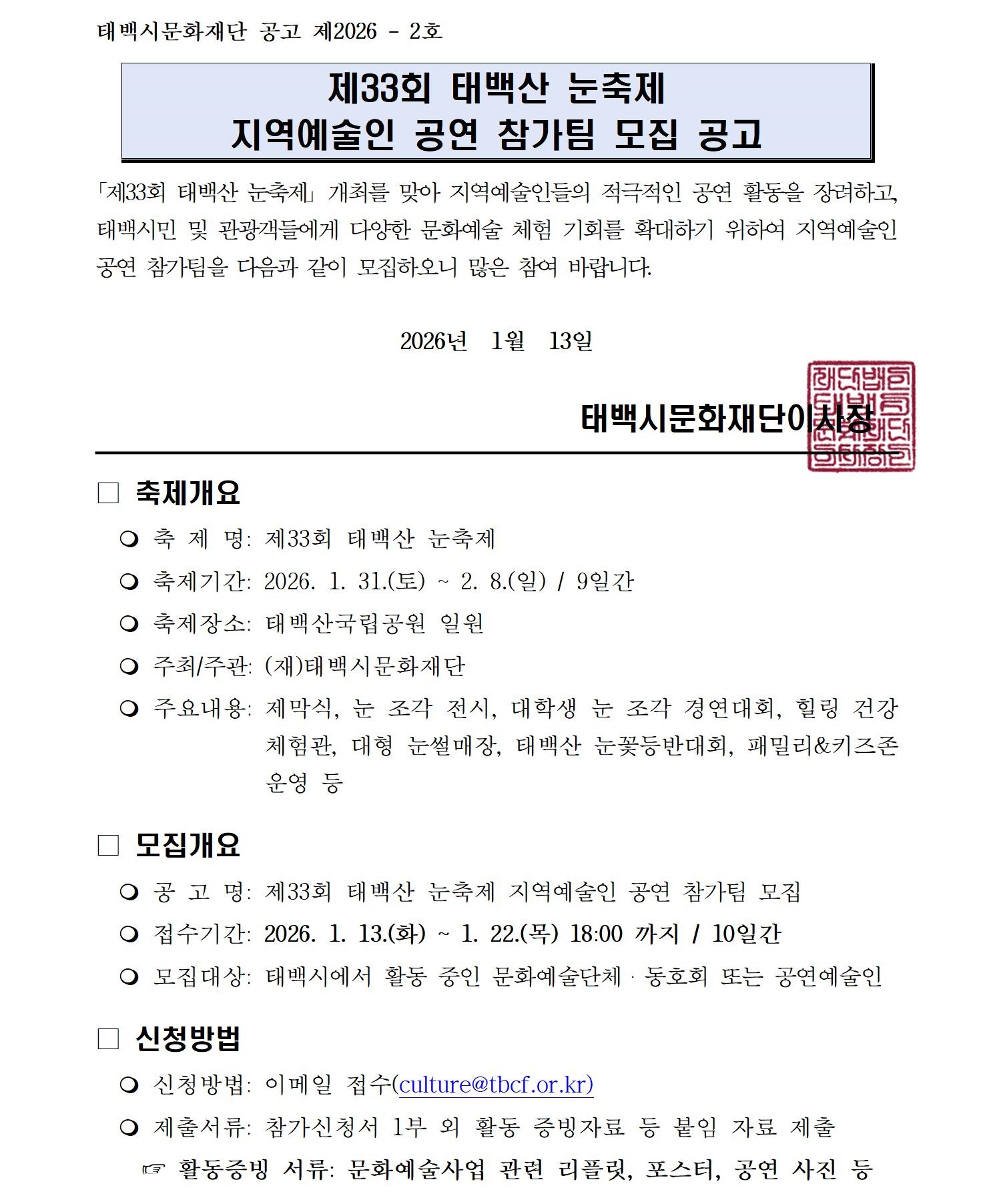 「제33회 태백산 눈축제」 지역예술인 공연 참가팀 모집 공고