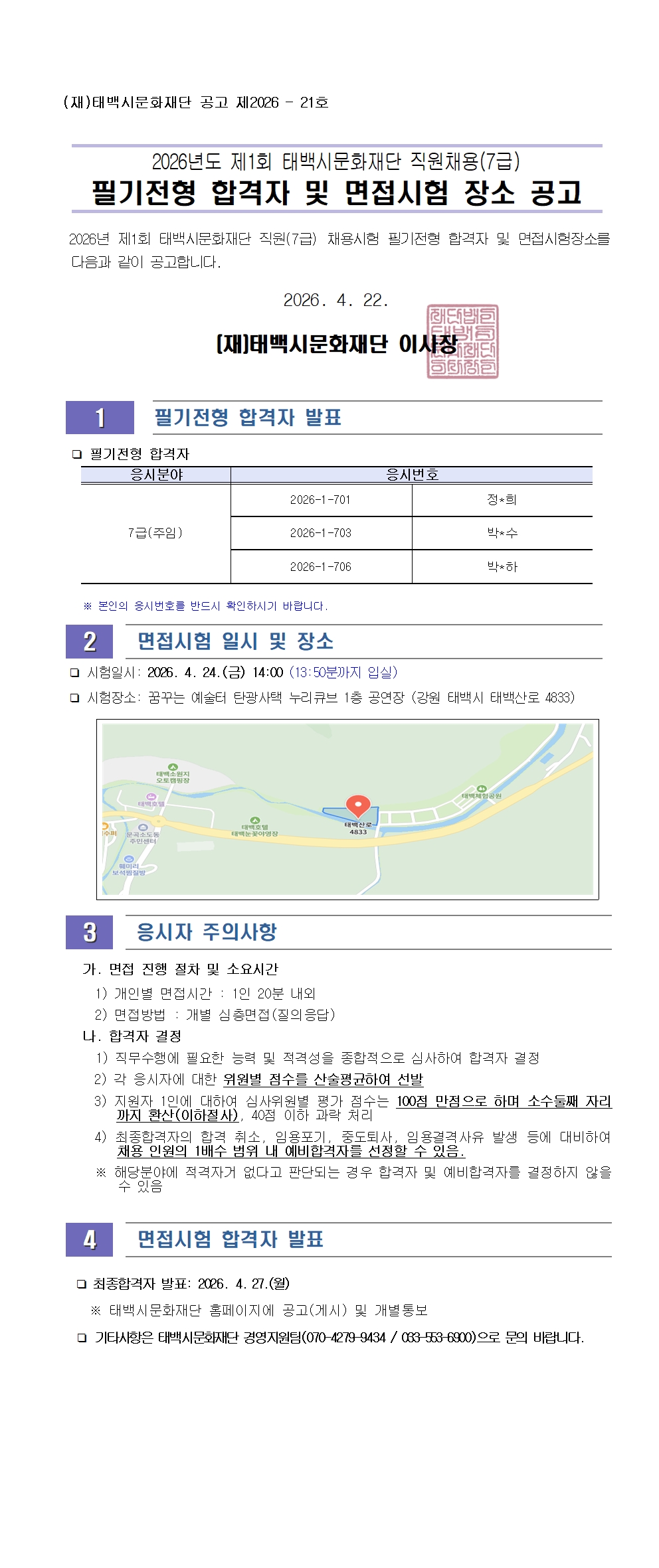 2026년 제1회 태백시문화재단 직원채용 필기시험 합격자 및 면접시험 장소 공고