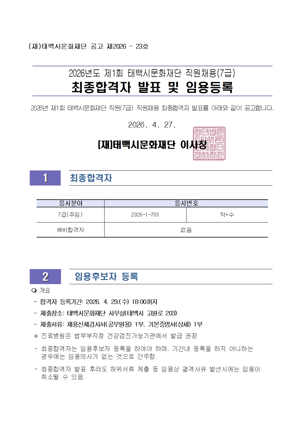 2026년 제1회 태백시문화재단 직원채용 최종합격자 발표 및 임용등록 공고