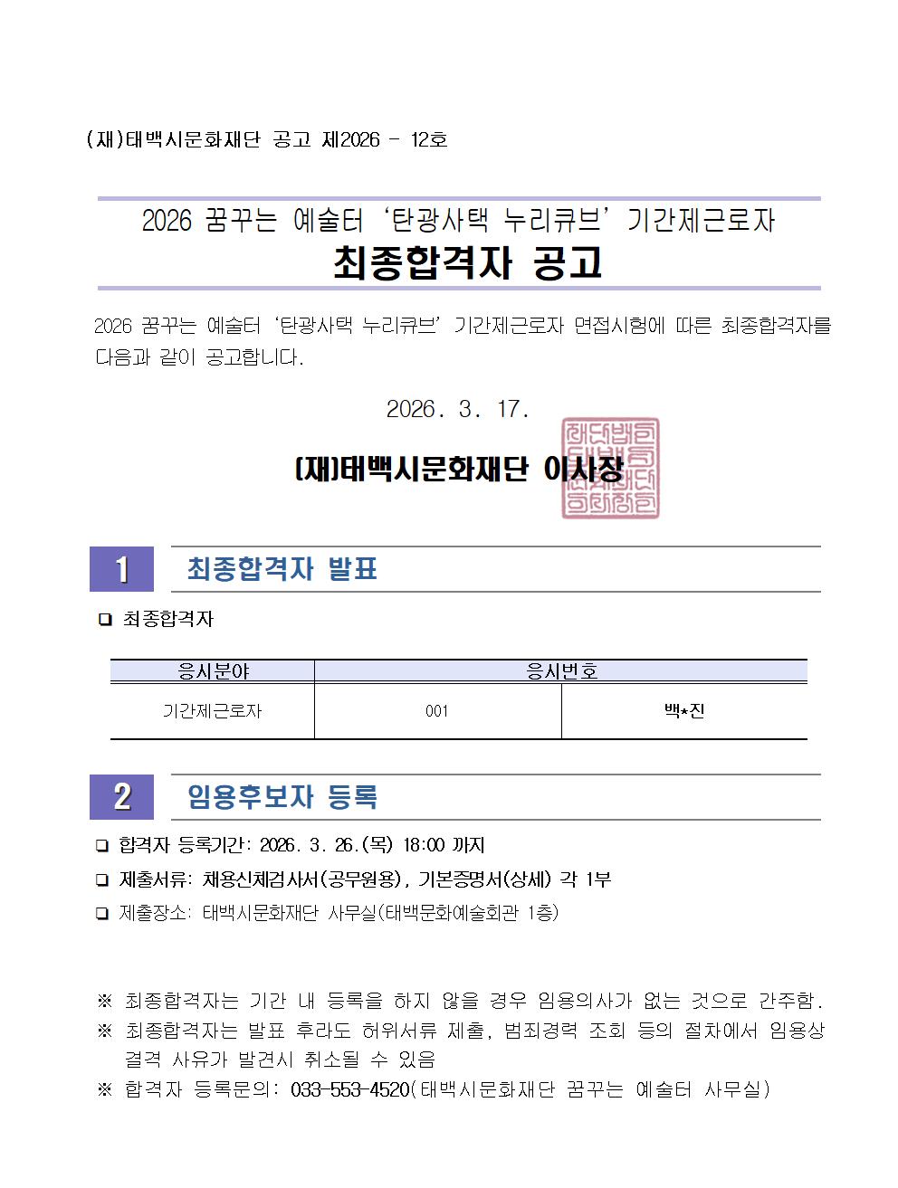 2026 꿈꾸는 예술터 '탄광사택 누리큐브' 기간제 근로자 최종합격자 공고