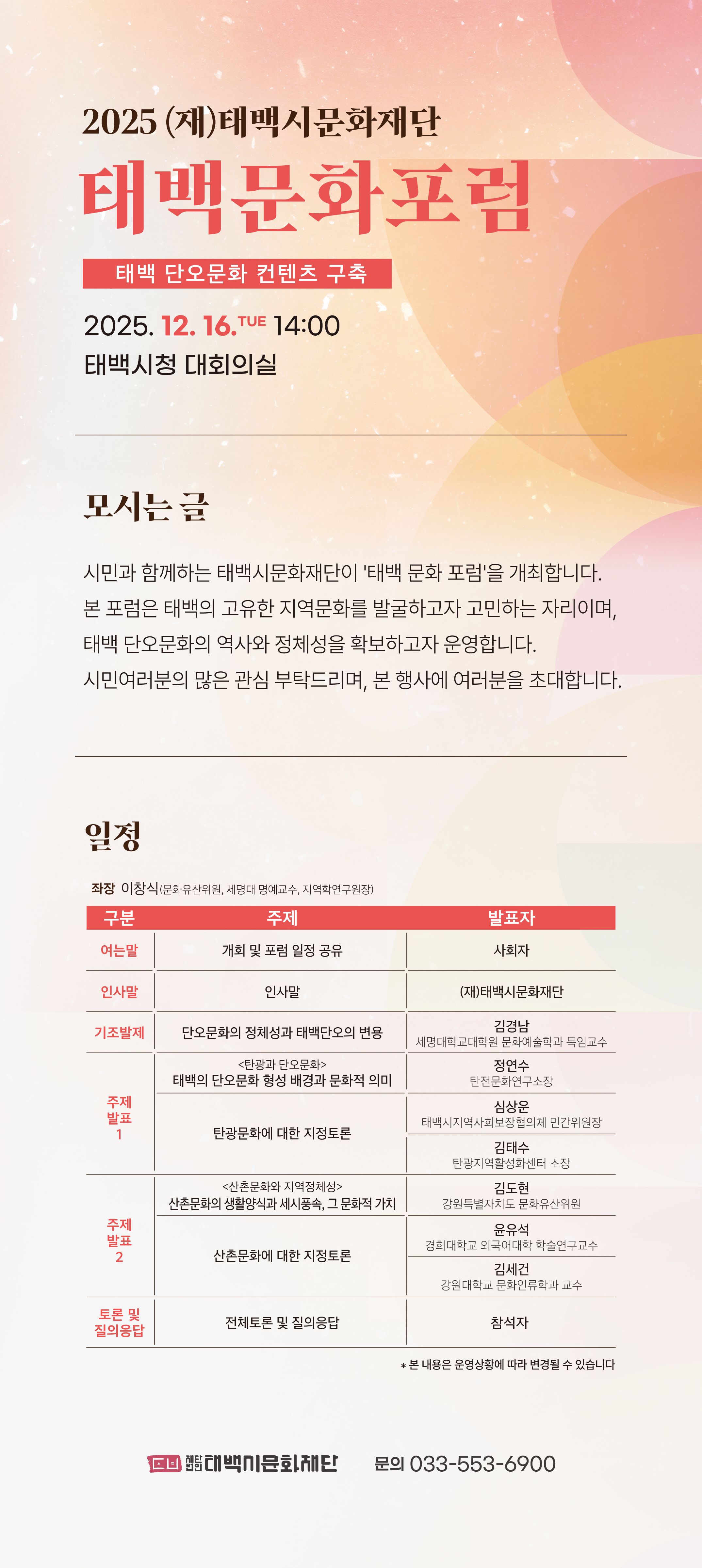 시민과 함께하는 태백시문화재단이 '태백 문화 포럼'을 개최합니다.