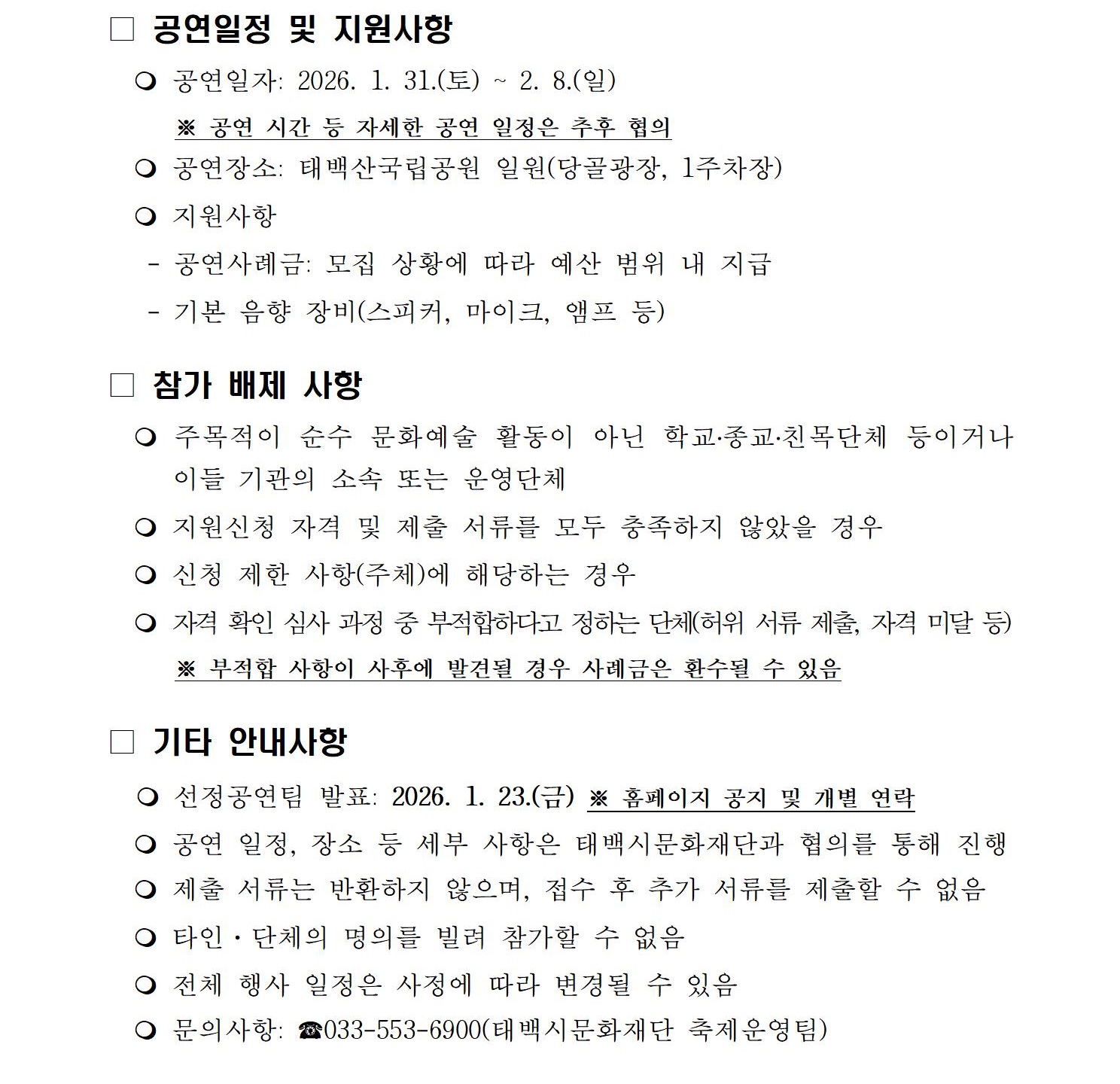 「제33회 태백산 눈축제」 지역예술인 공연 참가팀 모집 공고