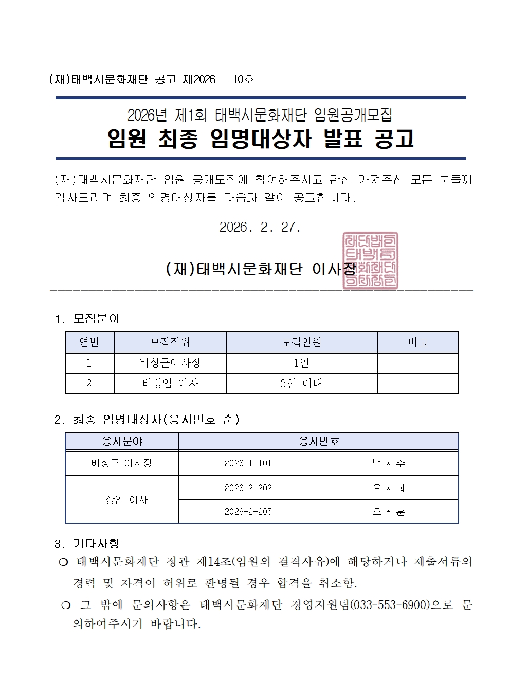 2026년 제1회 태백시문화재단 임원공개모집 최종 임명대상자 공고
