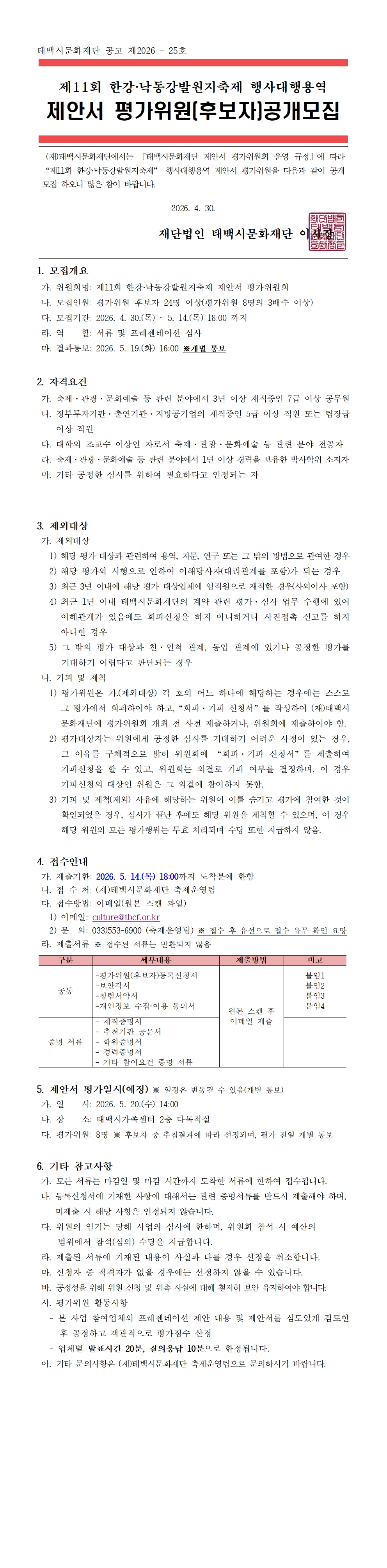 제11회 한강 낙동강 발원지 축제 행사 대행 용역 제안서 평가위원(후보자) 공개모집
