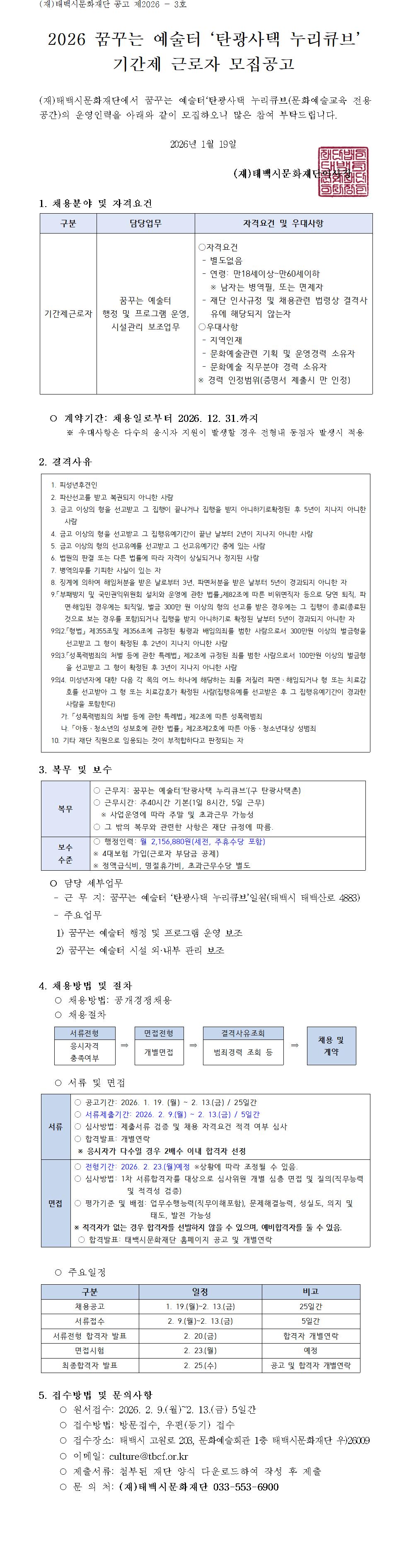 2026 꿈꾸는 예술터 '탄광사택 누리큐브' 기간제 근로자 모집 공고