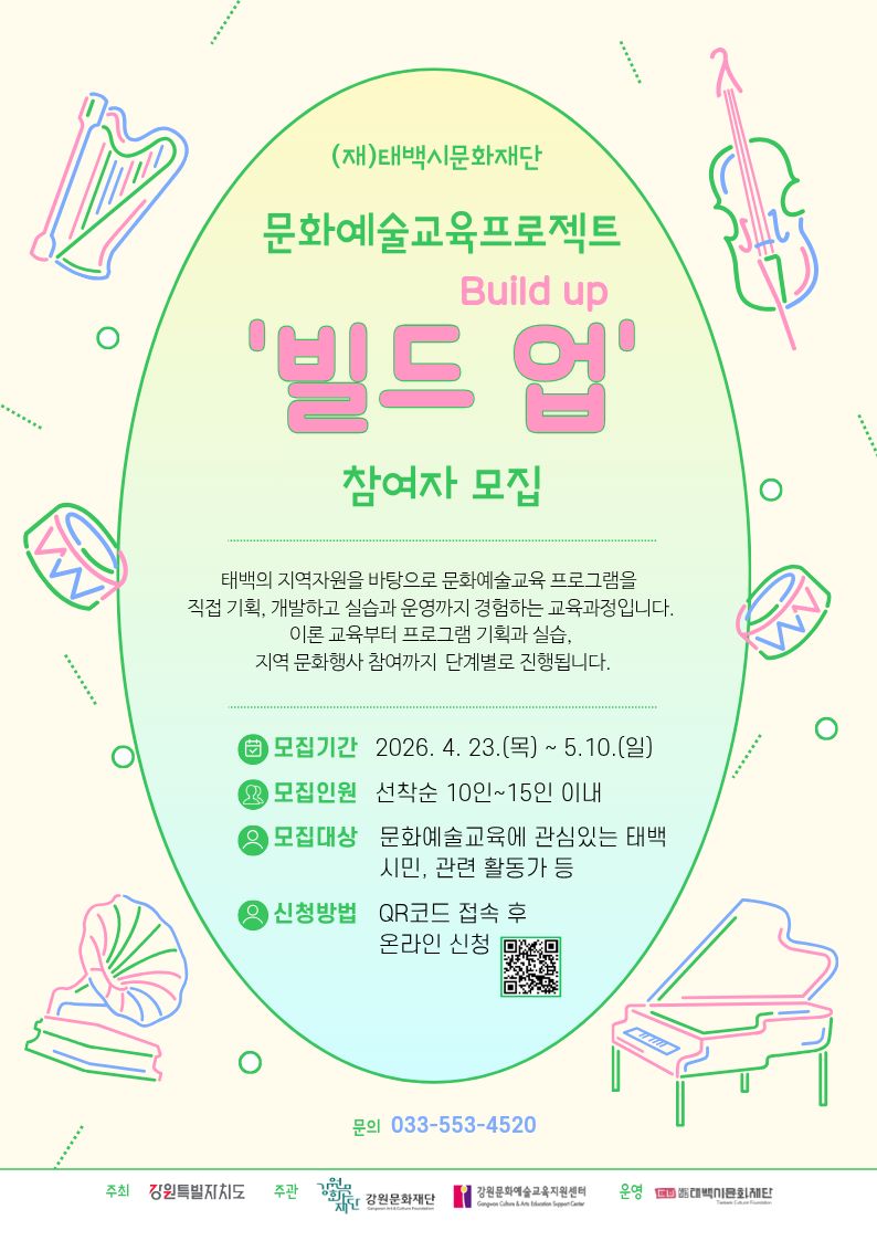(재)태백시문화재단(이사장 백현주)이 지역 문화예술교육 인력 양성과 지속 가능한 문화예술 생태계 조성을 위해「2026 태백 문화예술교육 프로젝트‘빌드 업(Build up)’」참여자를 모집한다. 이번 사업은 강원문화재단‘2026 기초재...