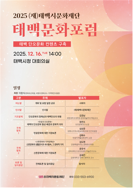 □ (재)태백시문화재단(이사장 이상호)은 12.16.(화) 14시, 태백시청 대회의실에서 ‘2025 태백 문화포럼을’ 진행한다. □ 본 포럼은 태백의 단오문화 콘텐츠를 발굴을 위해 ‘태백 단오문화 컨텐츠 구축’이라는 주제로 ▲기조발제...